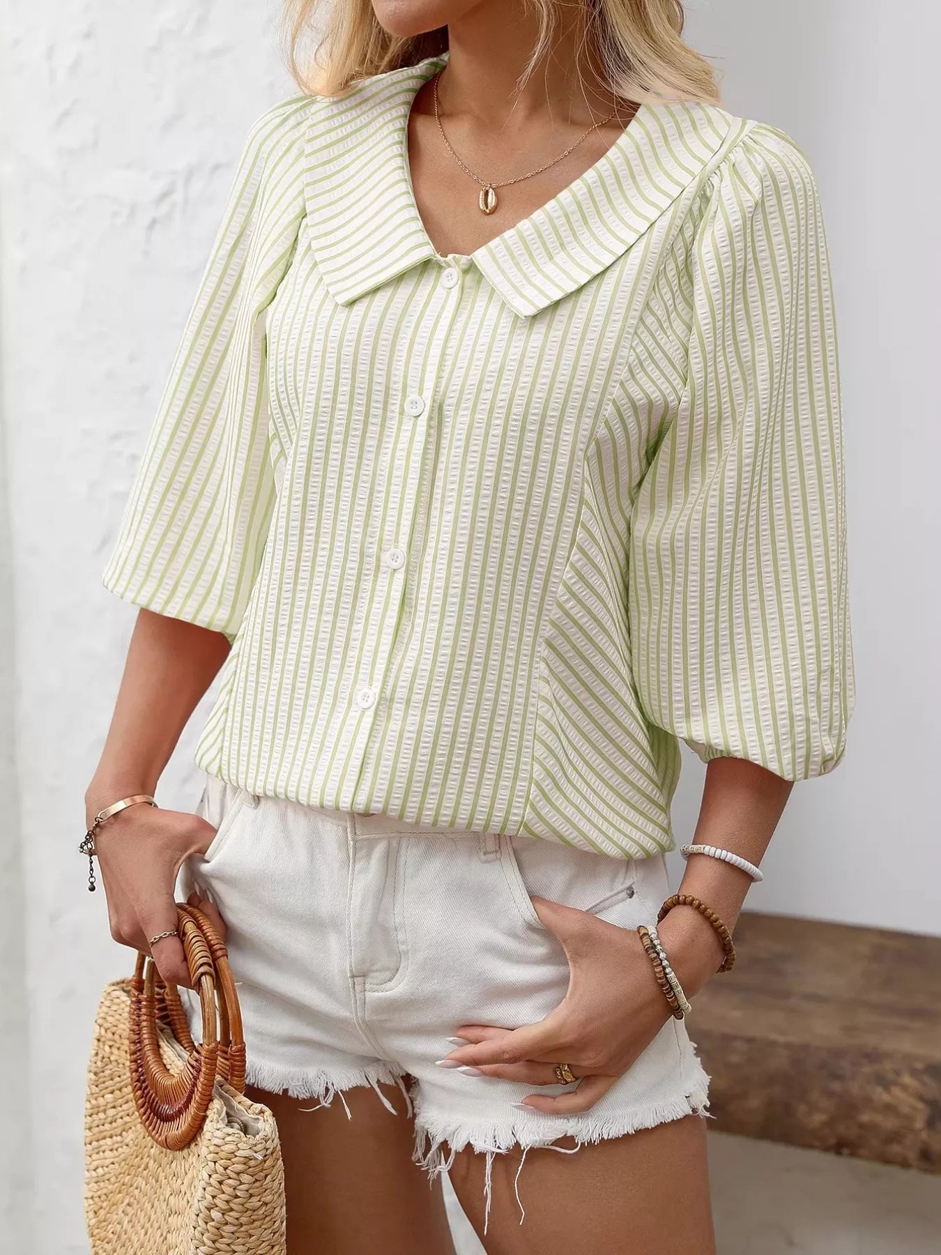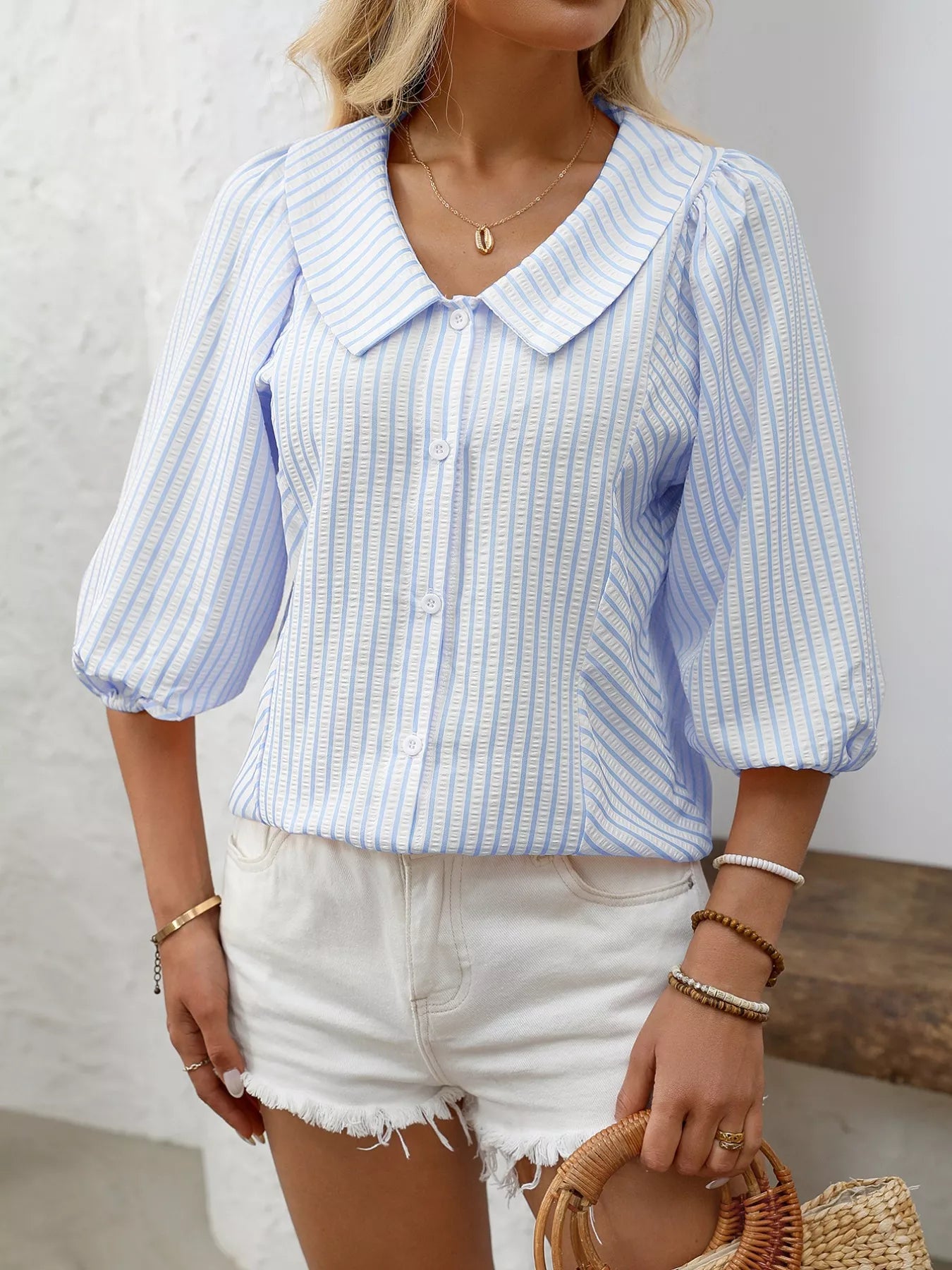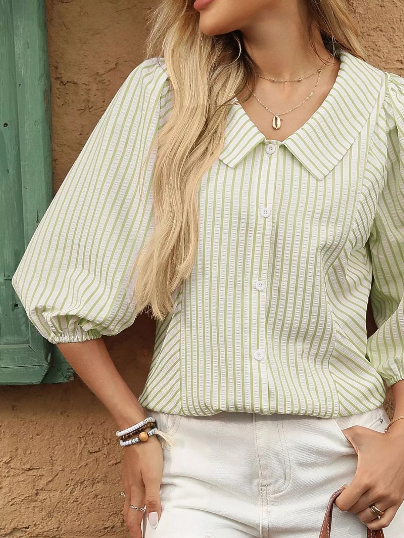 This romantic blouse is a timeless addition to your wardrobe. The delicate stripes, elegant collar, and subtle puff sleeves give it a feminine and stylish look. Thanks to the lightweight fabric and comfortable fit, it’s perfect for both spring and summer.