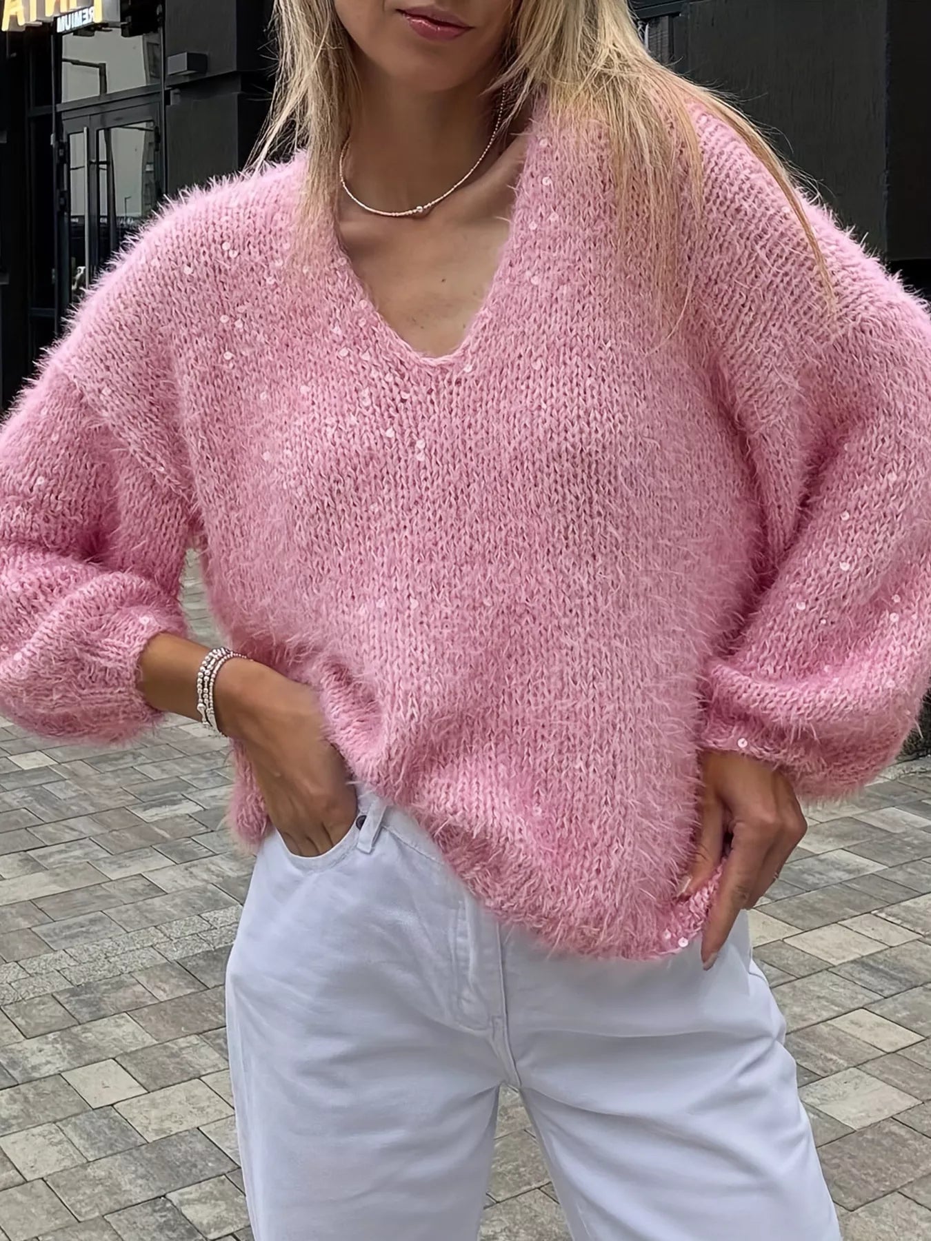 With its elegant V-neckline and relaxed fit, you can wear this sweater casually with jeans or dress it up with tailored trousers or a skirt. Ideal for everyday wear, yet perfect for those moments when you want to add something a little extra — without any effort.